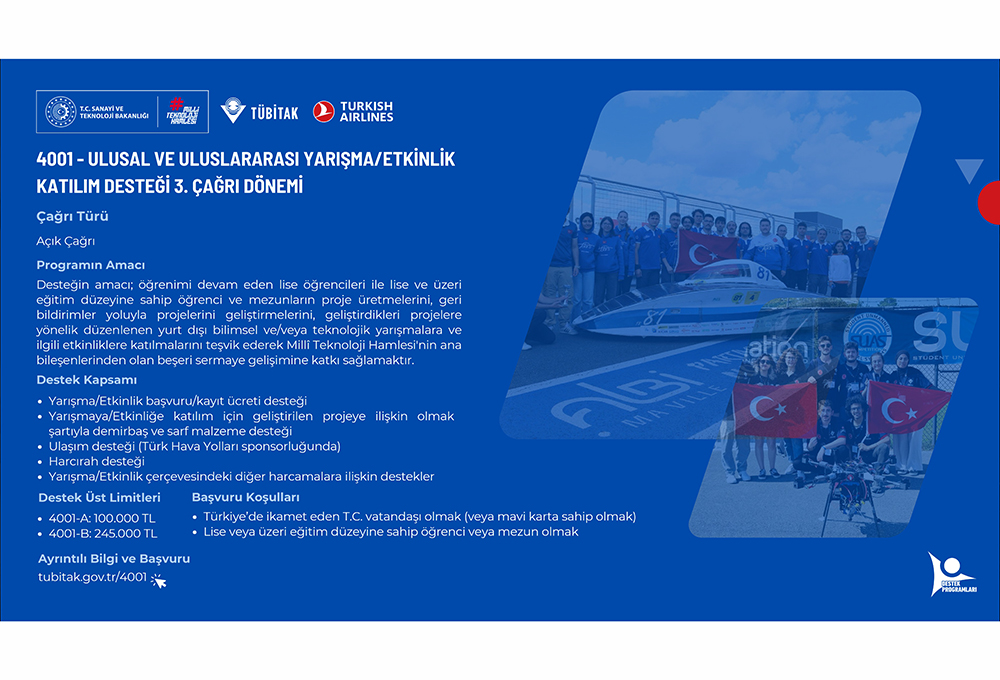 4001-B çağrısı ile yurt dışı bilimsel veya teknolojik yarışma ve etkinliklere katılım desteklenmektedir.
